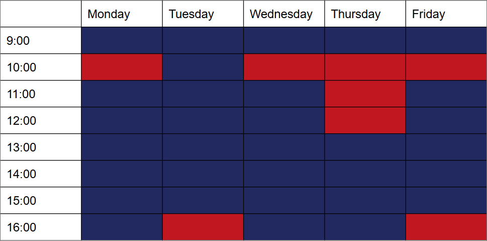 Here are the club’s office hours for the Fall 2025 Semester! The MooseLodge will be open, and an Exec will be present for any time block in Blue. For all time blocks in Red, the MooseLodge will be closed.